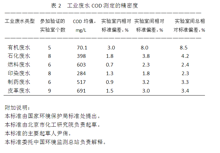 40個不同的實驗室測定COD值為500mg/L的鄰苯二甲酸氫鉀(4.7)標準溶液,其標準為20mg/L,相對標準偏差為4.0%。 8.2.2 工業(yè)廢水測定的精密度(見表2)。
