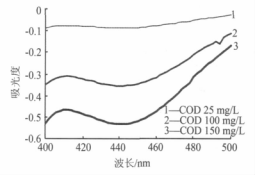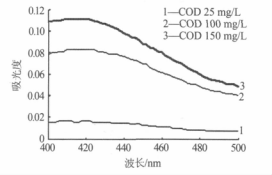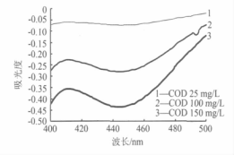 由圖 1 可知,在400~500 nm 波長范圍內(nèi),對應于水樣 COD 從 25 mg/L 變到 100 mg/L,重鉻酸鉀氧化所產(chǎn)生的 Cr(Ⅲ)的吸光度變化**大只有 0.06 多